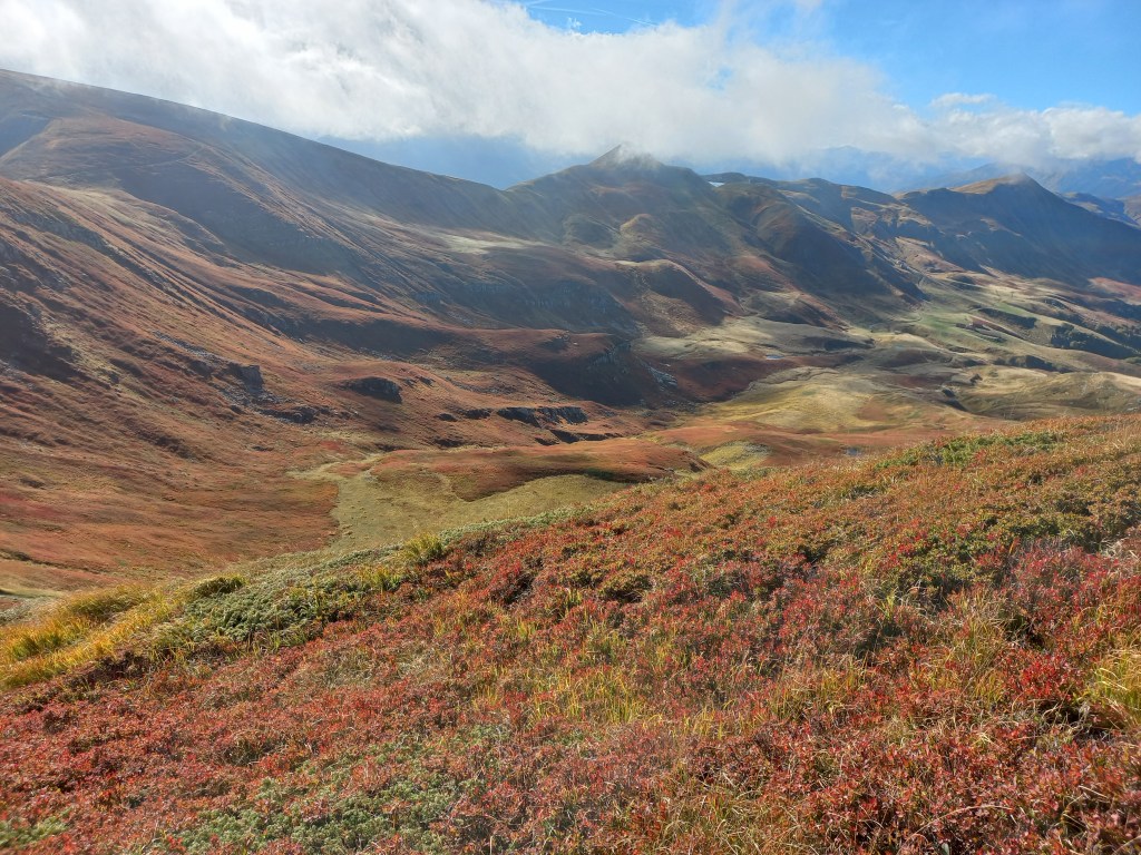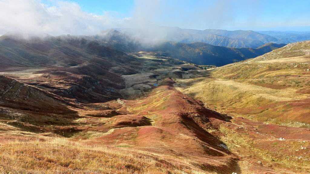 Usciti dal bosco si apre uno scenario incantevole, una gradazione di colori autunnali, si cammina ancora in salita e sembra di passeggiare in un quadro.