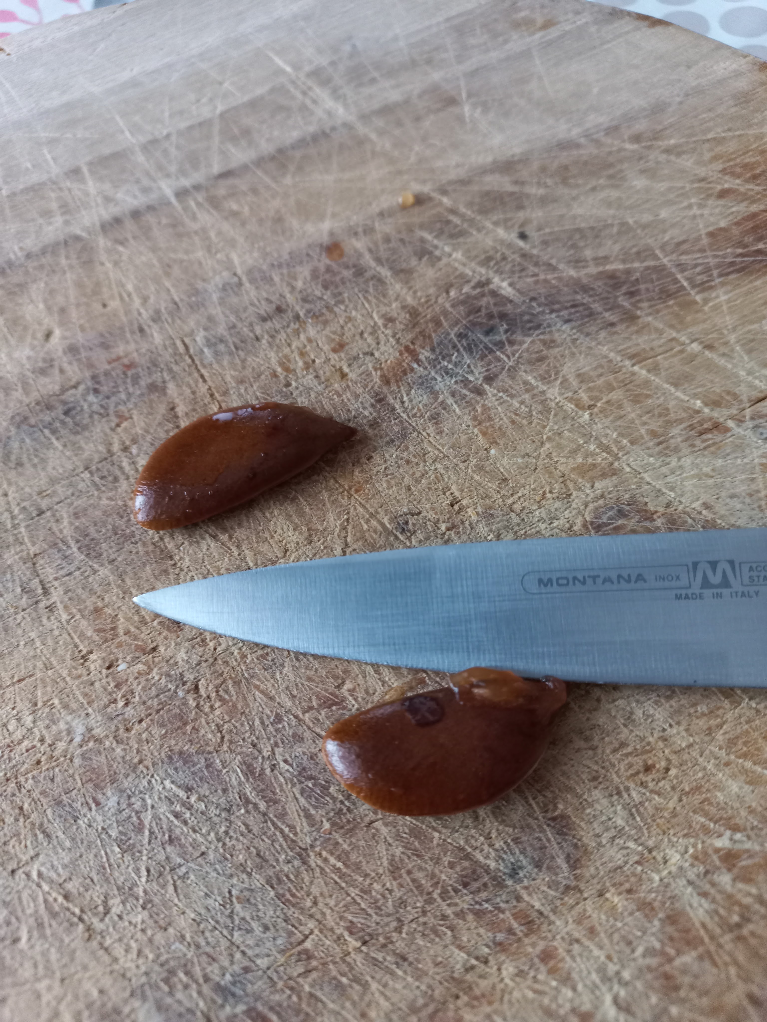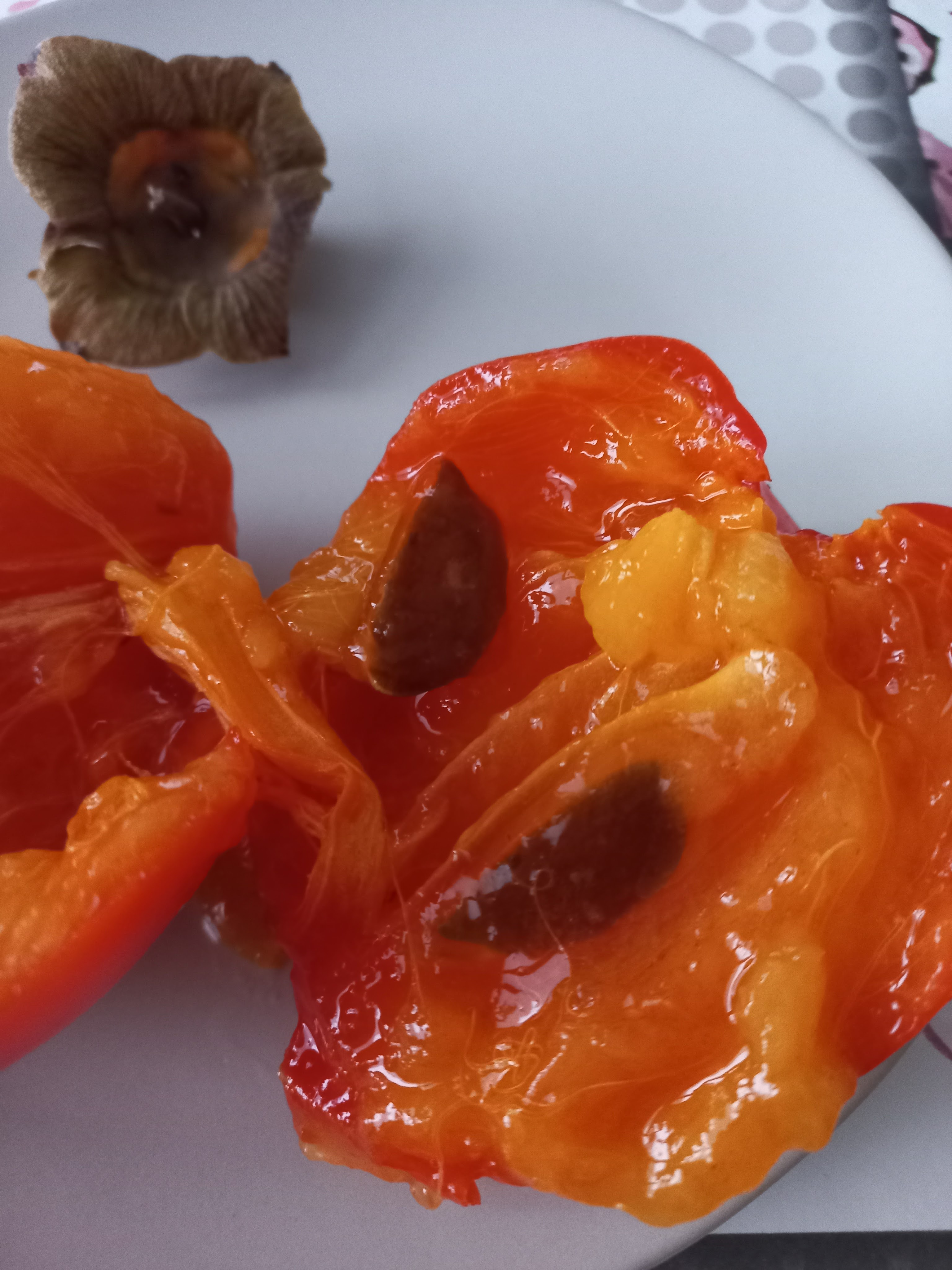 Forse non tutti sanno che all’interno dei frutti cachi/kaki (può essere scritto in tutti e due i modi: la forma scritta kaki è di origine orientale) ci dovrebbero essere dei semi: la selezione delle varietà ha puntato a produrre cachi privi di semente ed è diventato sempre più raro trovarli, ma questa mattina ne ho trovati ben due.