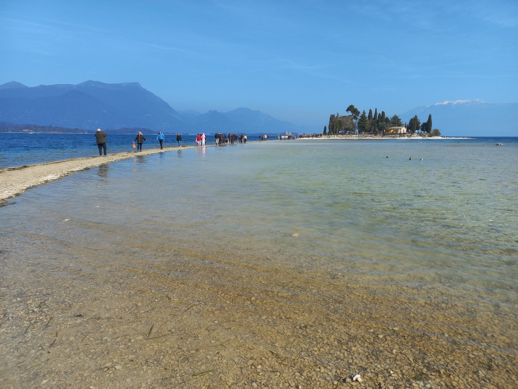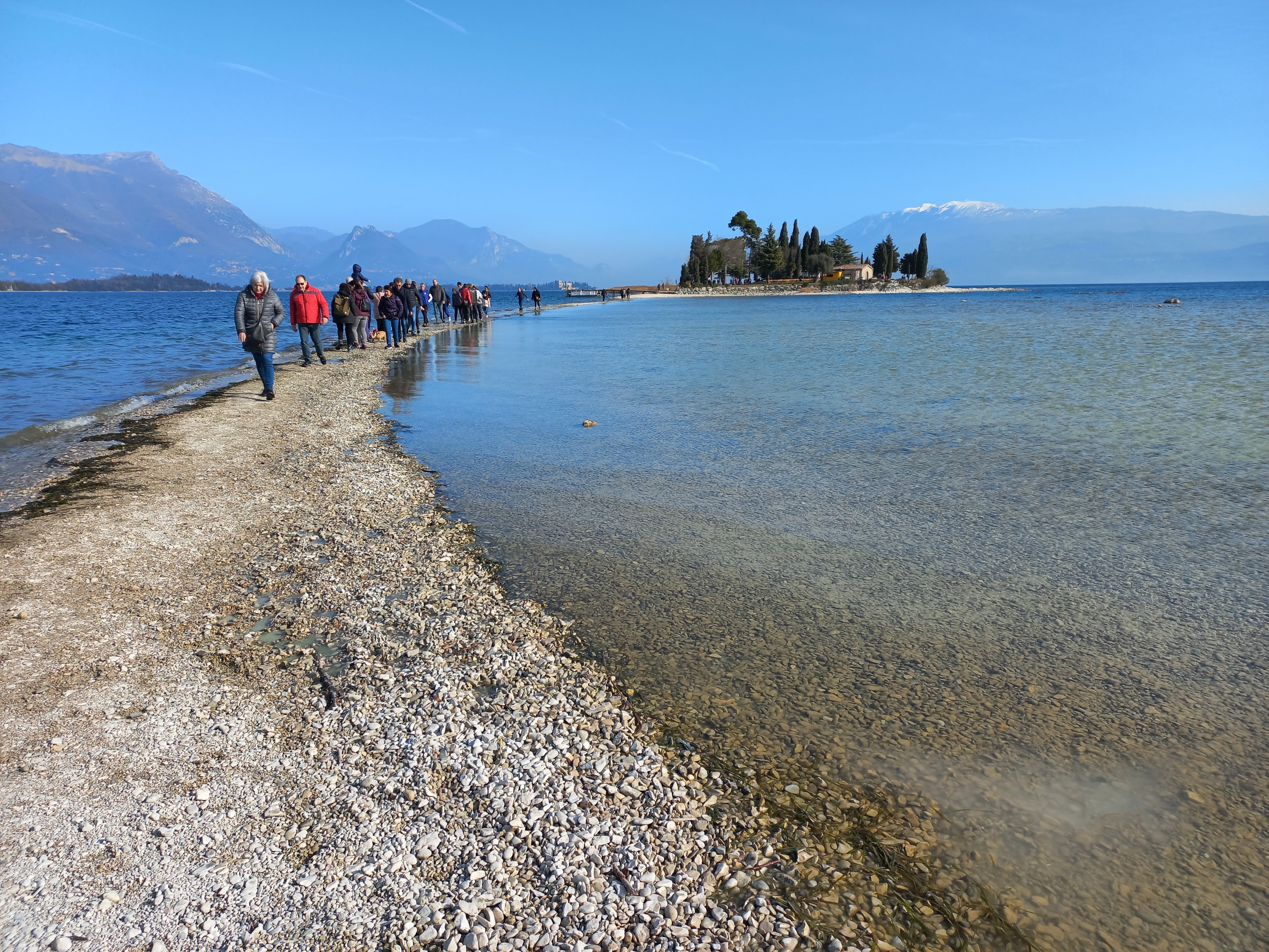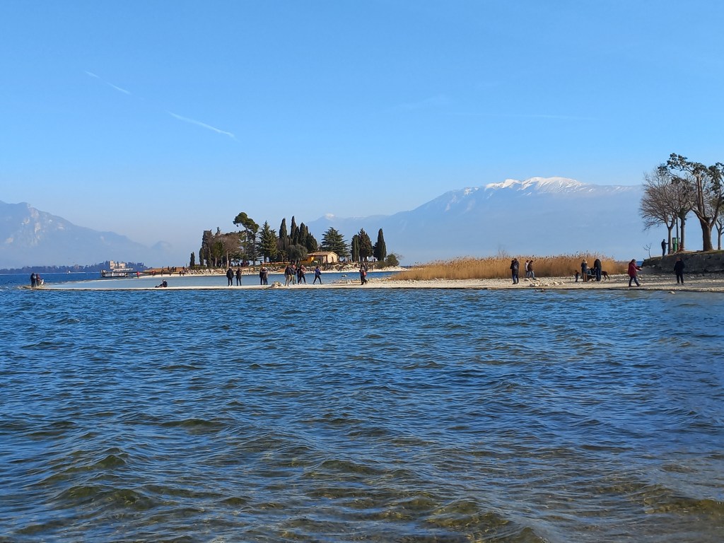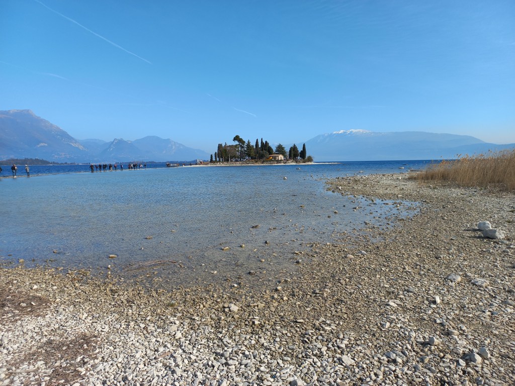 L’isola che sorge a circa 200 metri dalla sponda bresciana del lago di Garda, all’altezza della Punta Belvedere nel Comune di Manerba e tuttora di proprietà del Camping San Biagio, in questi giorni è stata soggetta di attenzioni, da parte di tg e social a causa della preoccupante siccità che ha riportato in superficie la sottile lingua di terra che la collega alla sponda del lago, trasformandola in una affascinante passerella a pelo d’acqua; affascinante ma anche alquanto inquietante tenendo conto del periodo in cui siamo: in pieno inverno. Può capitare di vederla riaffiorare in estate, ma vederla riaffiorare in inverno, purtroppo non è un buon segno.