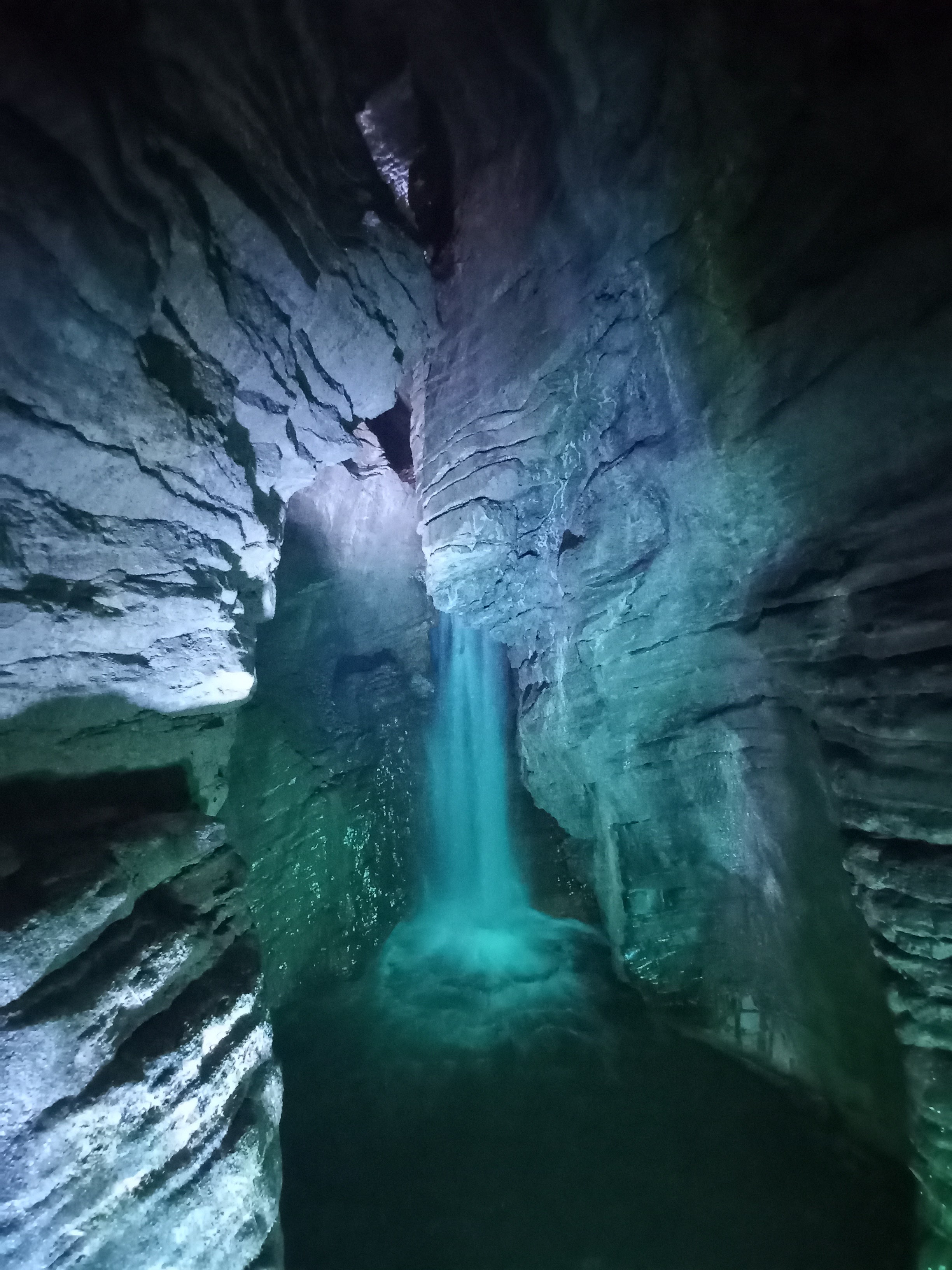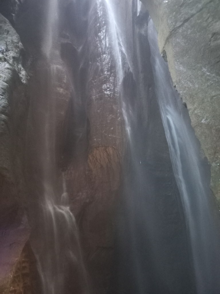 Entrati nella grotta superiore, alziamo lo sguardo per ammirare la cascata, viene il torcicollo tanto che sono alte e se guardiamo verso il basso… bhe alcuni potrebbero soffrire di vertigini.
