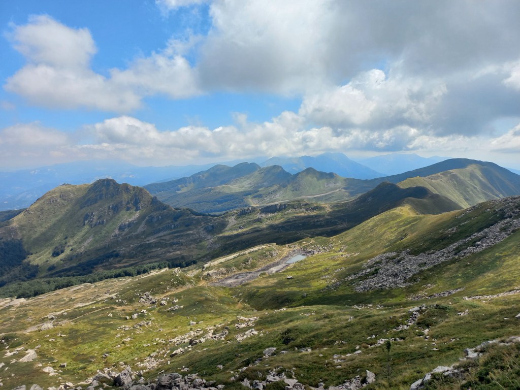 Continuando a camminare in direzione Sillara, alla nostra destra si fanno vedere i laghi Compione e davanti a noi si apre il crinale che sovrasta la zona Lagoni e Lago Santo, il mio occhio arriva sino al Monte Orsaro.